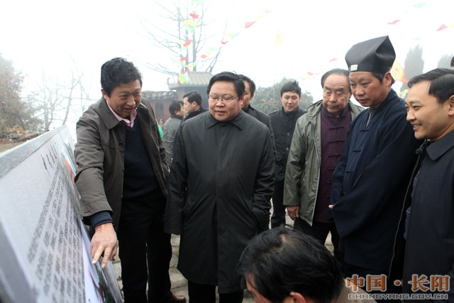 启动仪式现场 景区主管单位负责人、长阳土家族自治县民族宗教事务局局长戴勇致欢迎辞 特邀嘉宾湖北宜化集团总经理助理、办公室主任张振致辞 县委书记、县人大常委会主任马尚云讲话 宜昌市旅游局副局长吴炳华致辞 省委统战部副部长、省民族宗教事务委员会主任谭徽在讲话 省民宗委主任谭徽在、县委书记马尚云为中武当景区揭牌 领导嘉宾共同开启启动中武当国家4A级景区创建按钮 县委书记马尚云听取关于中武当创建国家4A景区规划的汇报 马尚云同湖北省道教协会副会长、中武当道观住持鄢金华交谈